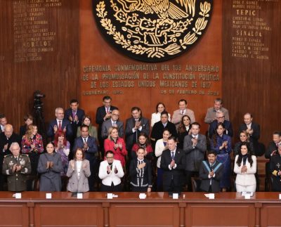 En la celebración del 109º aniversario de la Constitución, frente a Claudia Sheinbaum, la presidenta, Mauricio Kuri, gobernador de Querétaro,…