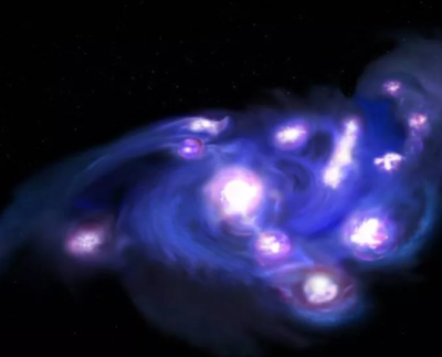 Detectan una antigua galaxia con forma de racimo de uvas en proceso de desintegración.