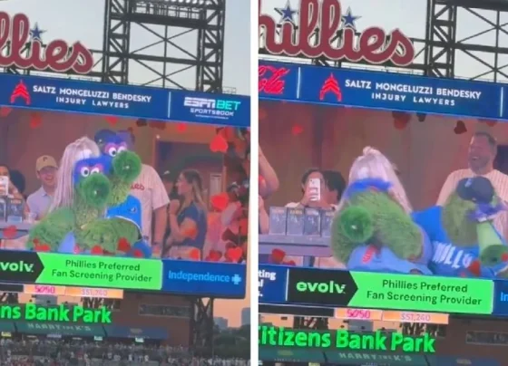 Las mascotas de los Philadelphia Phillies se unieron a una versión entretenida y ajustada del ‘cámara besos’ junto a otras mascotas.