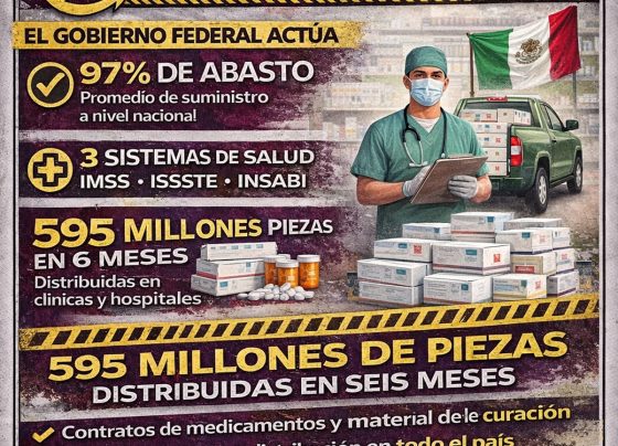 “El gobierno de la presidenta Claudia Sheinbaum reportó un avance del 97% en el abasto de medicamentos en las tres…